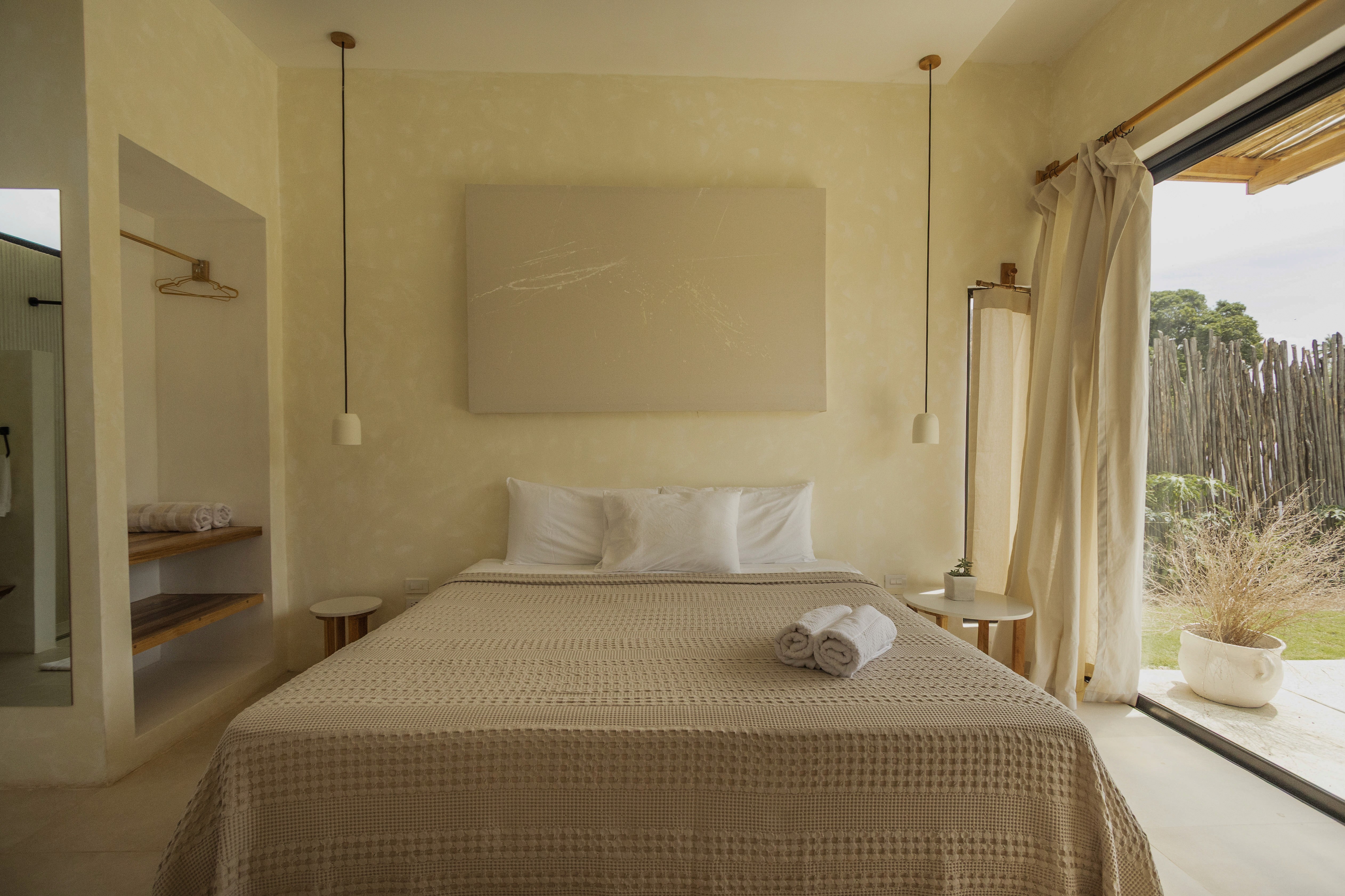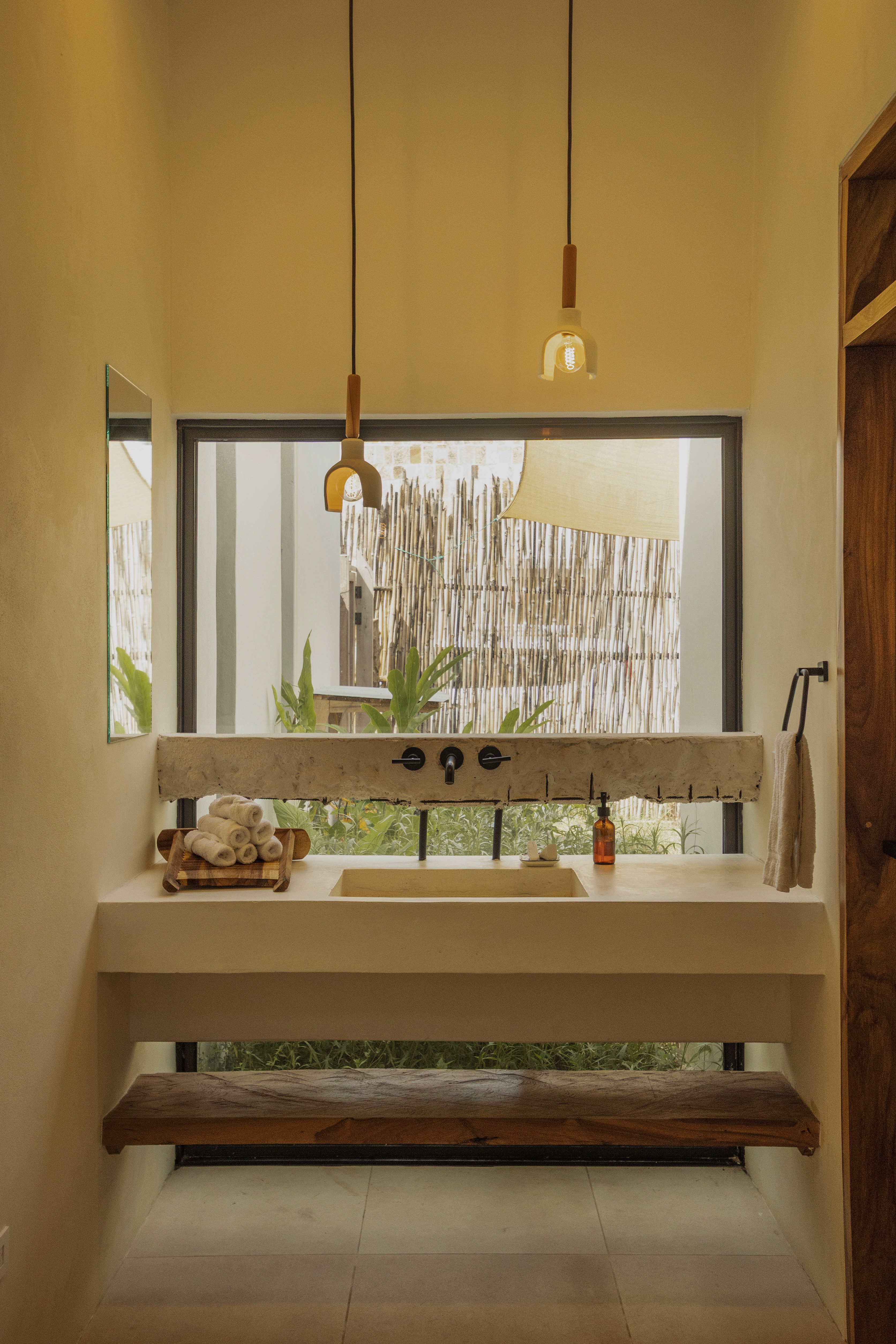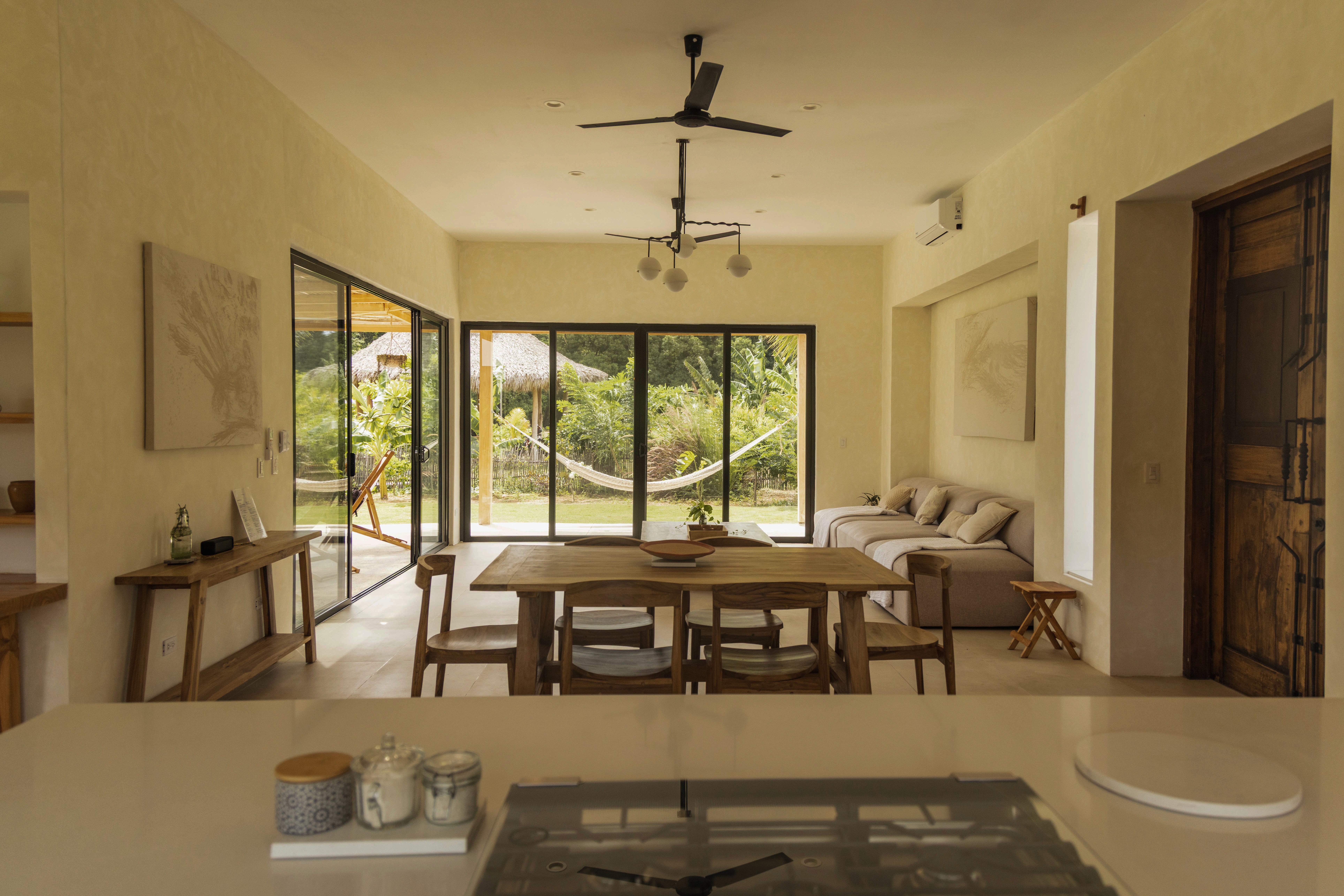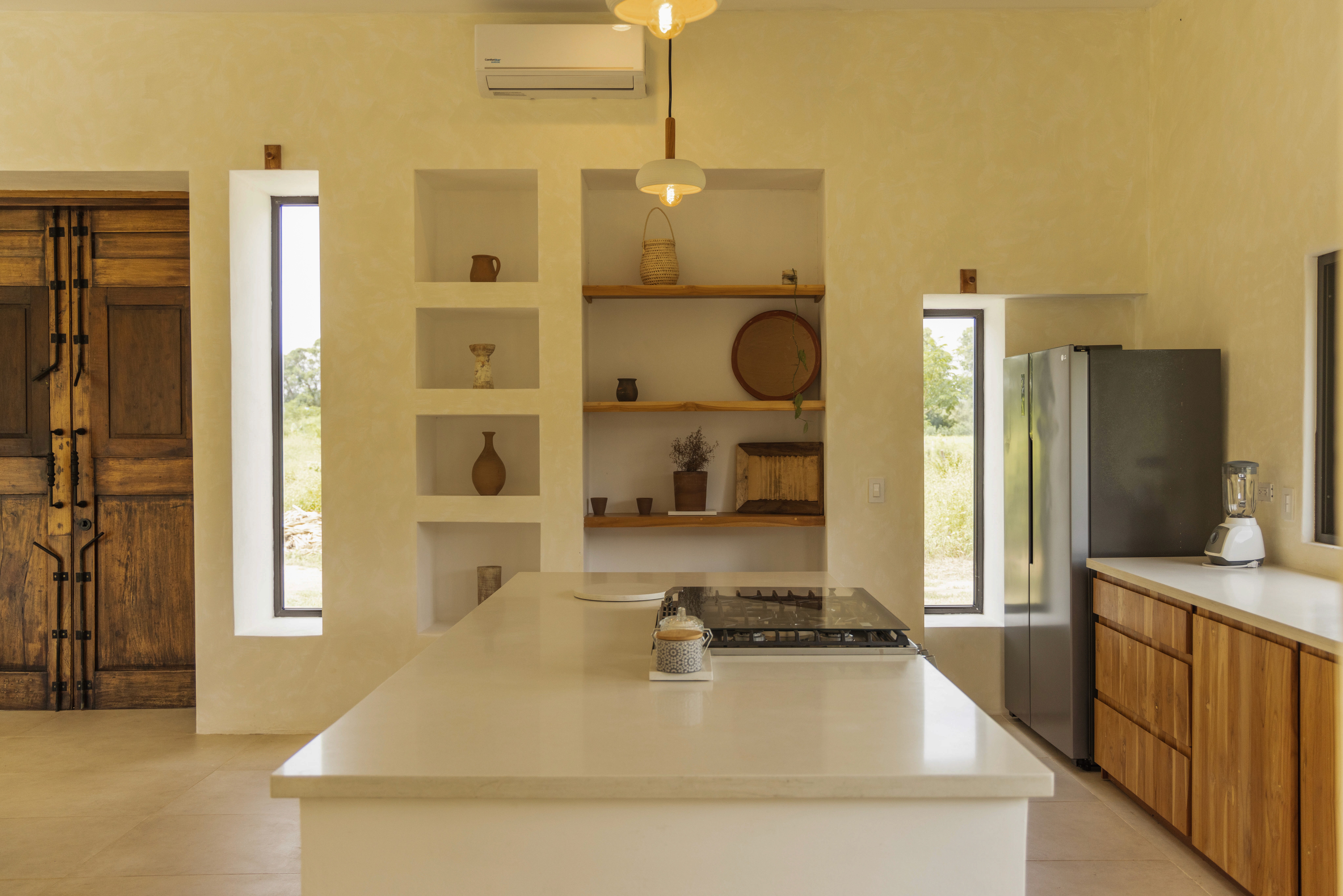 This kitchen interior design project in Nicaragua focuses on material transitions and crafted details. Wooden columns are intentionally separated from concrete walls, highlighting the honesty of each material and adding visual depth. Curved wall edges soften the geometry and enhance the flow of natural light, creating a warm, enveloping atmosphere.