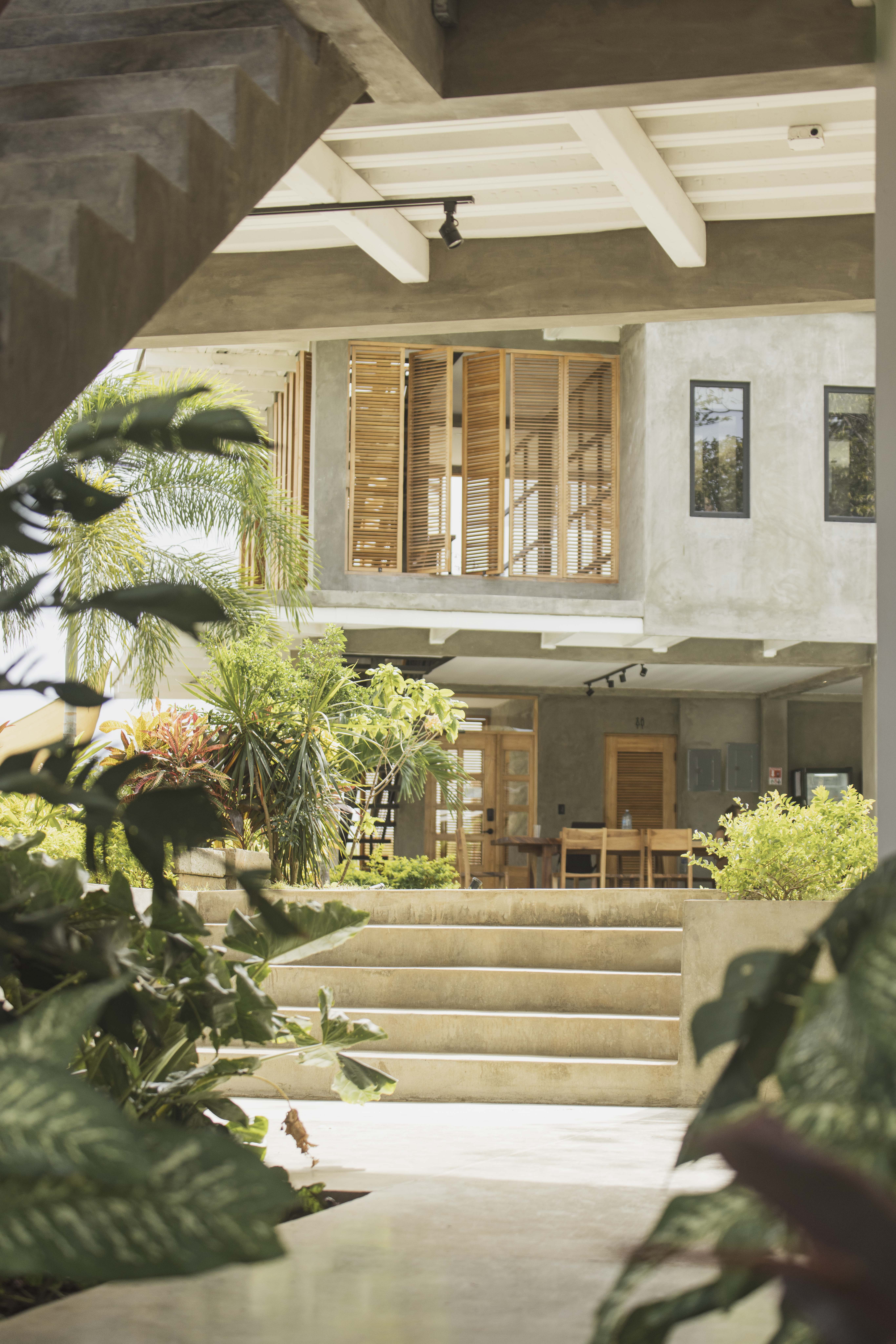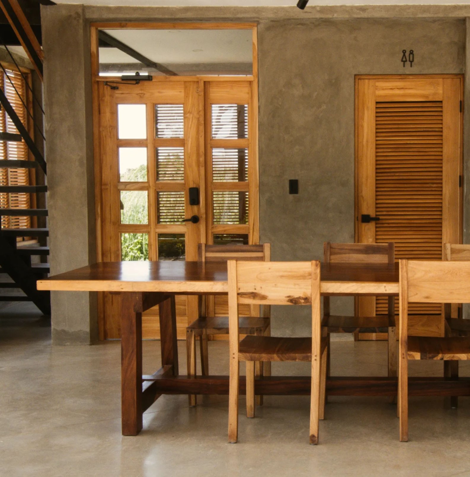 This kitchen interior design project in Nicaragua focuses on material transitions and crafted details. Wooden columns are intentionally separated from concrete walls, highlighting the honesty of each material and adding visual depth. Curved wall edges soften the geometry and enhance the flow of natural light, creating a warm, enveloping atmosphere.